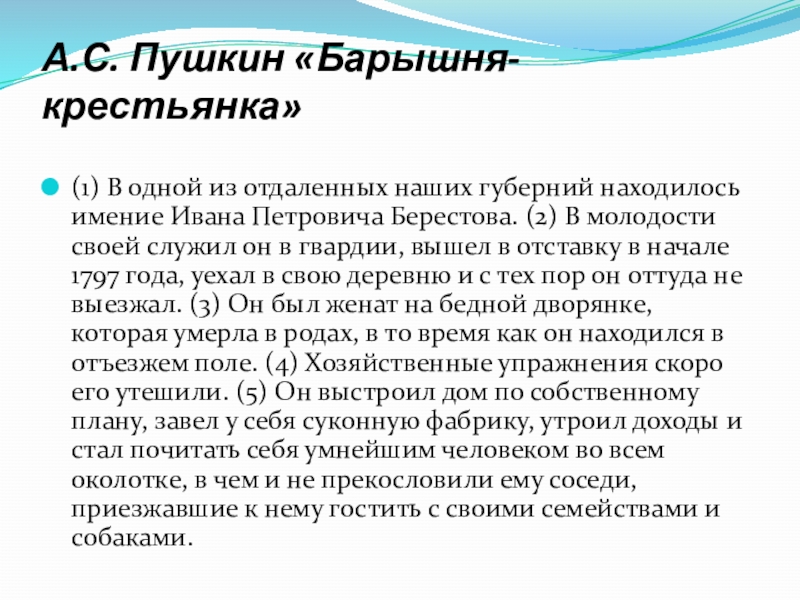 Ивана Петровича Берестова. (2) В молодости своей служил он в гвардии, вышел в отставку в начале 1797 года, уехал в свою деревню и с тех пор он оттуда не выезжал. (3) Он был женат на бедной дворянке, которая умерла в родах, в то время как он находился в отъезжем поле. (4) Хозяйственные упражнения скоро его утешили. (5) Он выстроил дом по собственному плану, завел у себя суконную фабрику, утроил доходы и стал почитать себя умнейшим человеком во всем околотке, в чем и не прекословили ему соседи, приезжавшие к нему гостить с своими семействами и собаками.