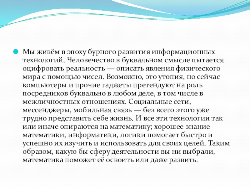смысле пытается оцифровать реальность — описать явления физического мира с помощью чисел. Возможно, это утопия, но сейчас компьютеры и прочие гаджеты претендуют на роль посредников буквально в любом деле, в том числе в межличностных отношениях. Социальные сети, мессенджеры, мобильная связь — без всего этого уже трудно представить себе жизнь. И все эти технологии так или иначе опираются на математику; хорошее знание математики, информатики, логики помогает быстро и успешно их изучить и использовать для своих целей. Таким образом, какую бы сферу деятельности вы ни выбрали, математика поможет её освоить или даже развить.