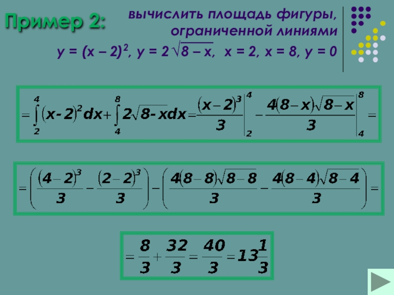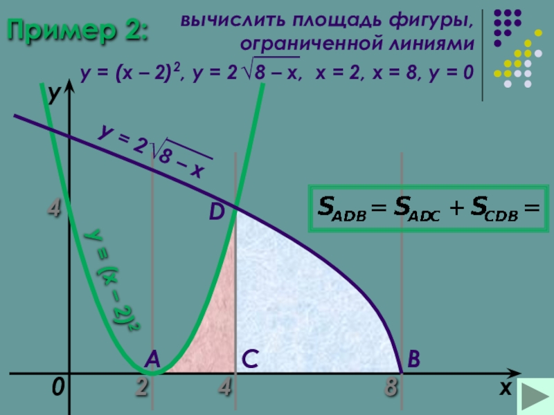 Пример 1:вычислить площадь фигуры, ограниченной линиями y = x2, y = x + 2.xyy = x2y =