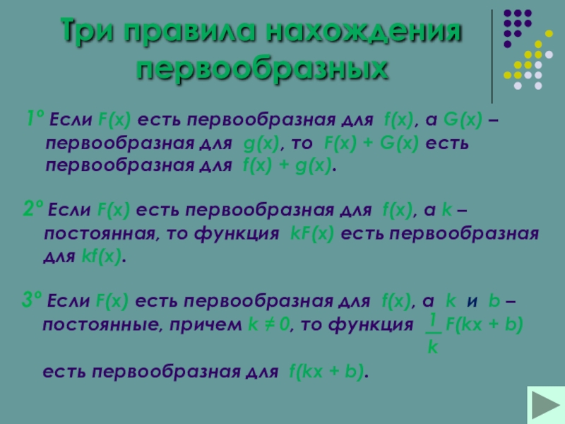 Три правила нахождения первообразных1º Если F(x) есть первообразная для f(x), а G(x) –   первообразная для