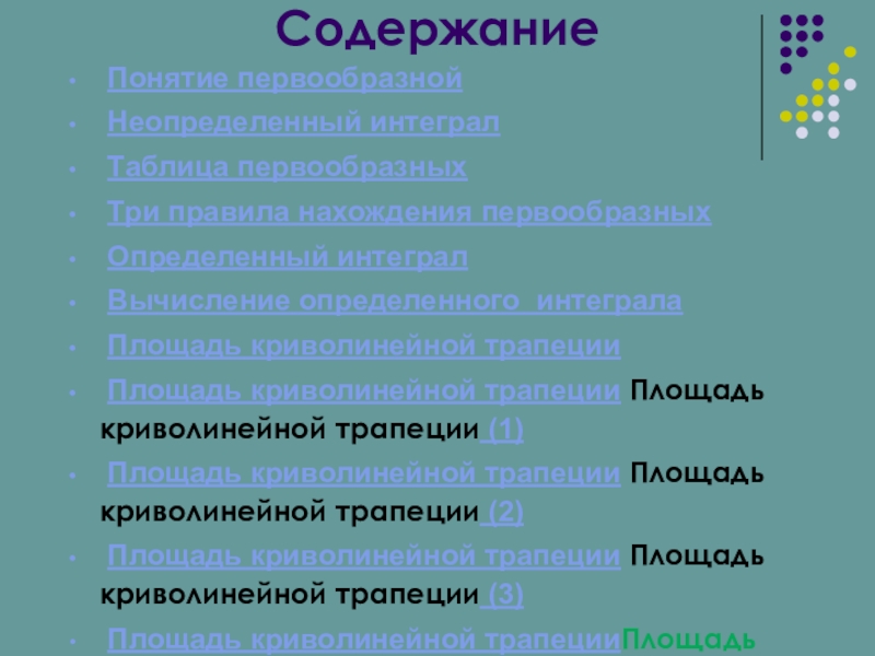 Содержание Понятие первообразной Неопределенный интеграл Таблица первообразных Три правила нахождения первообразных Определенный интеграл Вычисление определенного интеграла Площадь