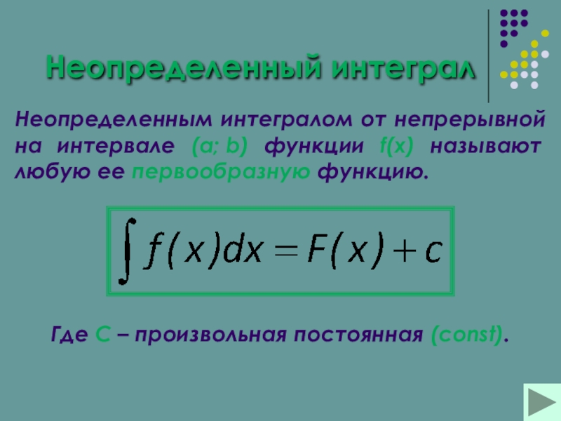 Неопределенный интегралНеопределенным интегралом от непрерывной на интервале (a; b) функции f(x) называют любую ее первообразную функцию.Где С