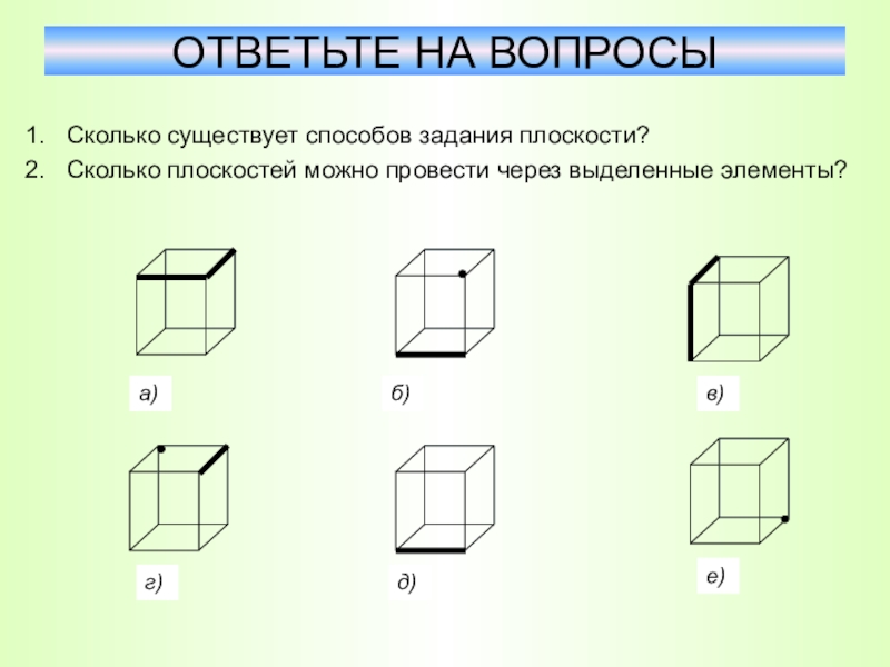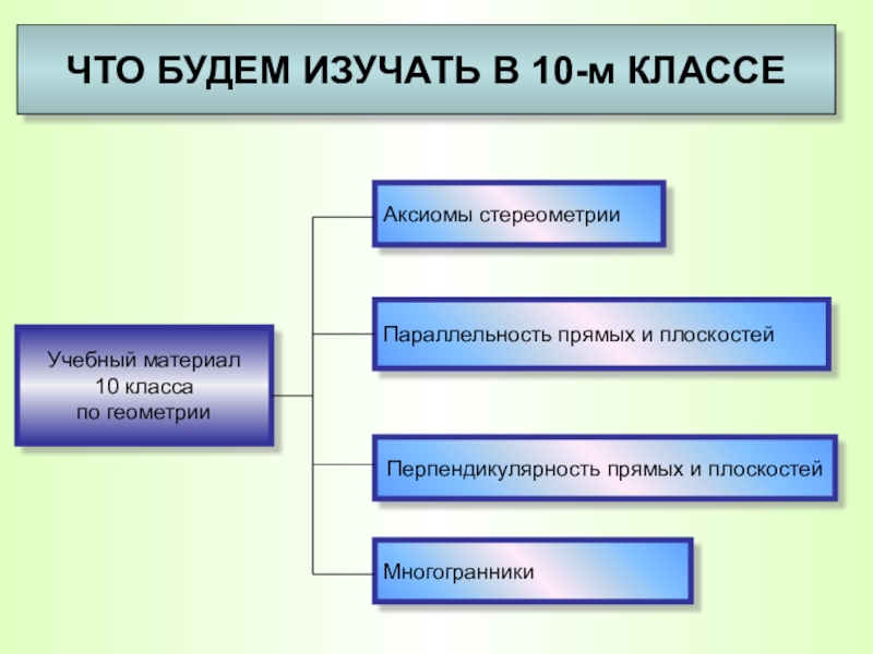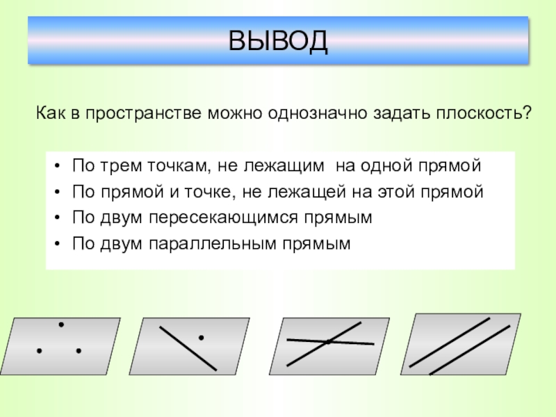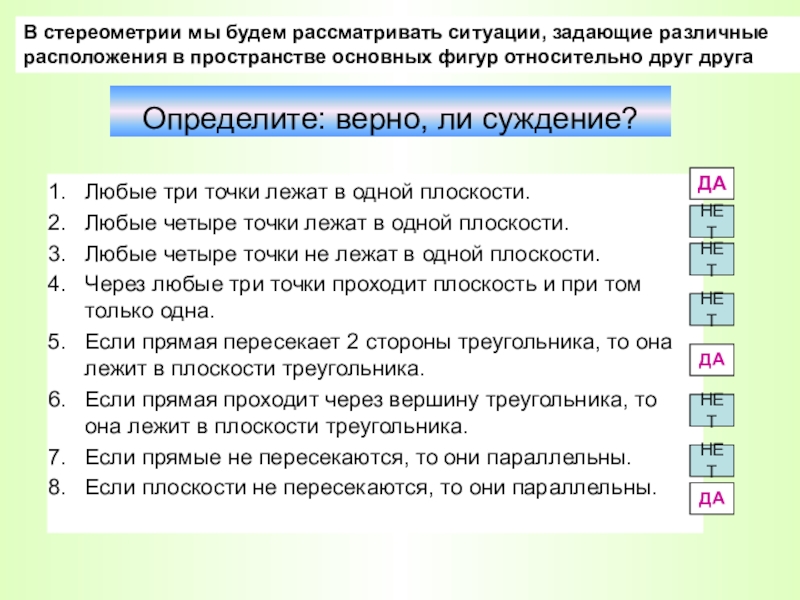 В стереометрии мы будем рассматривать ситуации, задающие различные расположения в пространстве основных фигур относительно друг друга