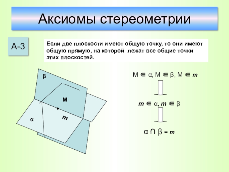 По А-1 через точки А, В и M проходит только одна плоскость — плоскость (ABM), Обозначим её α. Прямая m имеет с ней две общие точки — точки A и B, следовательно, по аксиоме А-2 эта прямая лежит в плоскости α..