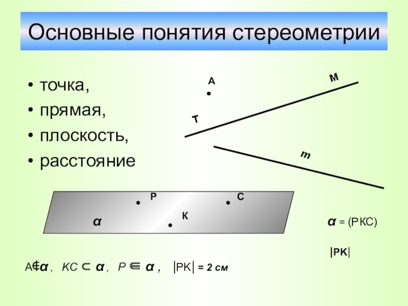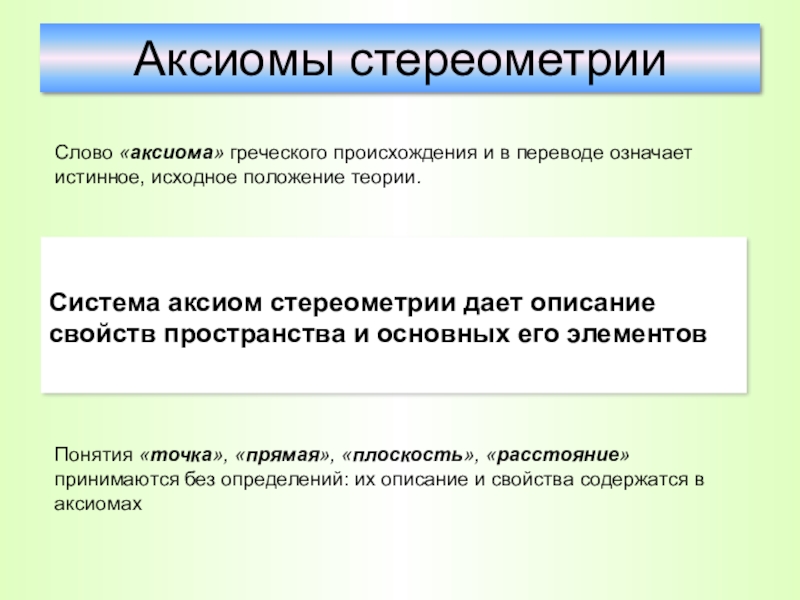 Понятия «точка», «прямая», «плоскость», «расстояние» принимаются без определений: их описание и свойства содержатся в аксиомах