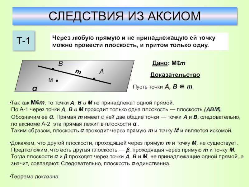 Докажем, что другой плоскости, проходящей через прямую m и точку M, не существует. Предположим, что есть другая плоскость — β, проходящая через прямую m и точку M. Тогда плоскости α и β проходят через точки А, В и M, не принадлежащие одной прямой, а значит, совпадают. Следовательно, плоскость α единственна.