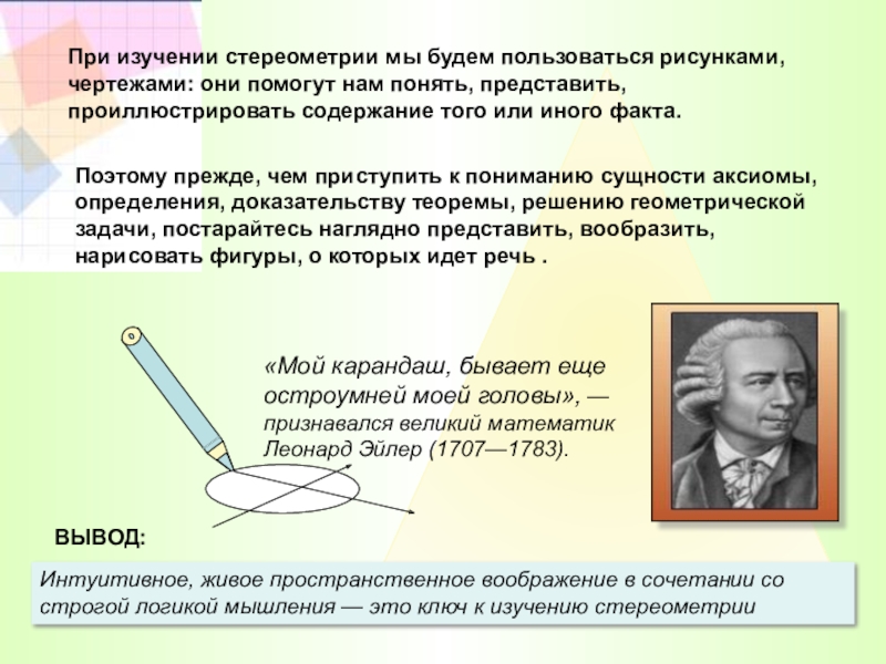 При изучении стереометрии мы будем пользоваться рисунками, чертежами: они помогут нам понять, представить, проиллюстрировать содержание того или иного факта.