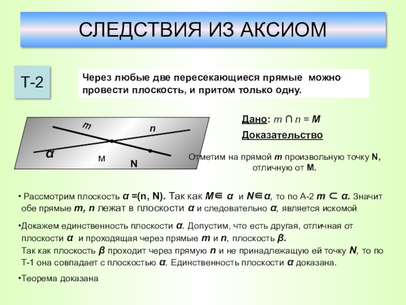 Рассмотрим плоскость α =(n, N). Так как M∈ α и N∈α, то по А-2 m ⊂ α. Значит обе прямые m, n лежат в плоскости α и следовательно α, является искомой