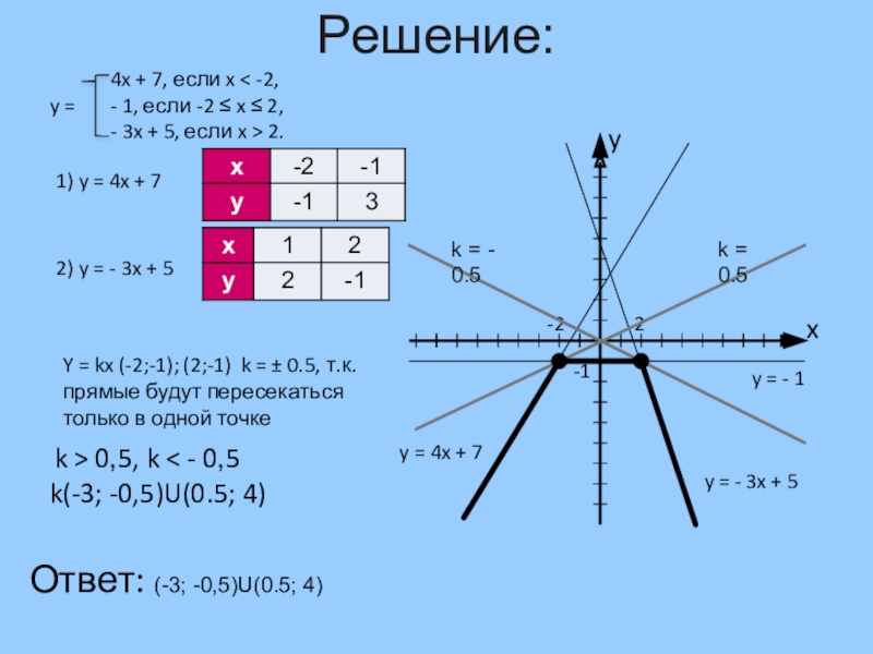 Y = kx (-2;-1); (2;-1) k = ± 0.5, т.к. прямые будут пересекаться только в одной точке