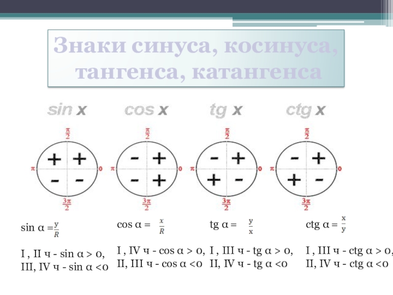 I , III ч - ctg > 0, II, IV ч - ctg <0
