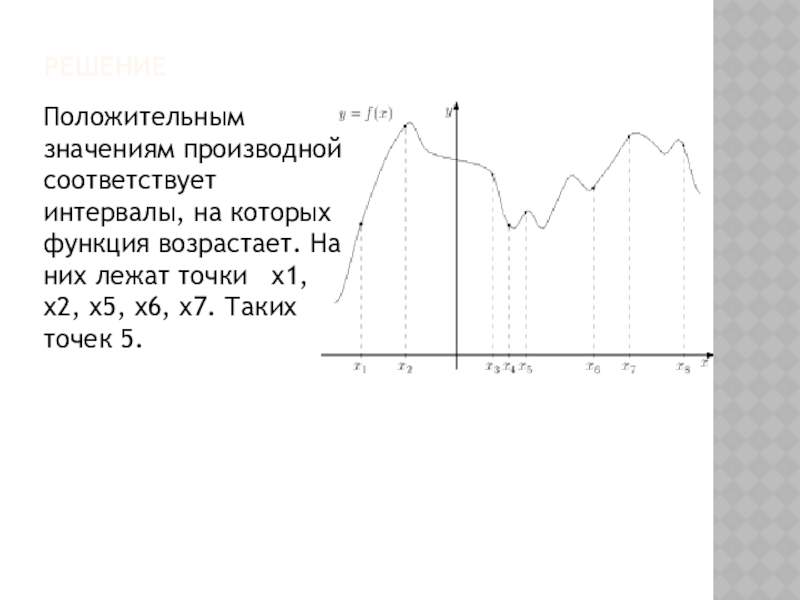 РЕШЕНИЕПоложительным значениям производной соответствует интервалы, на которых функция возрастает. На них лежат точки  х1, х2, х5,
