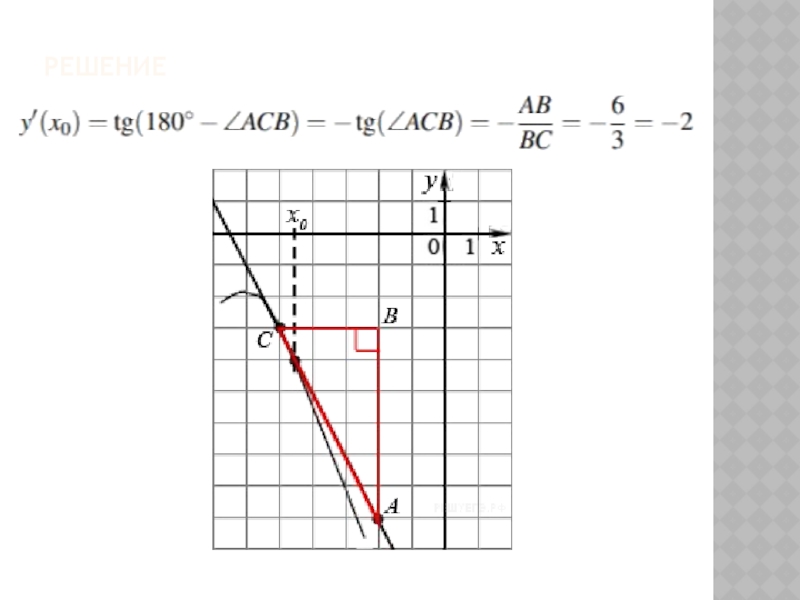 свою очередь равен тангенсу угла наклона данной касатель­ной к оси абсцисс. Построим треугольник с вершинами в точках A (1; 2), B (1; −4), C(−2; −4). Угол наклона касательной к оси абсцисс будет равен углу ACB