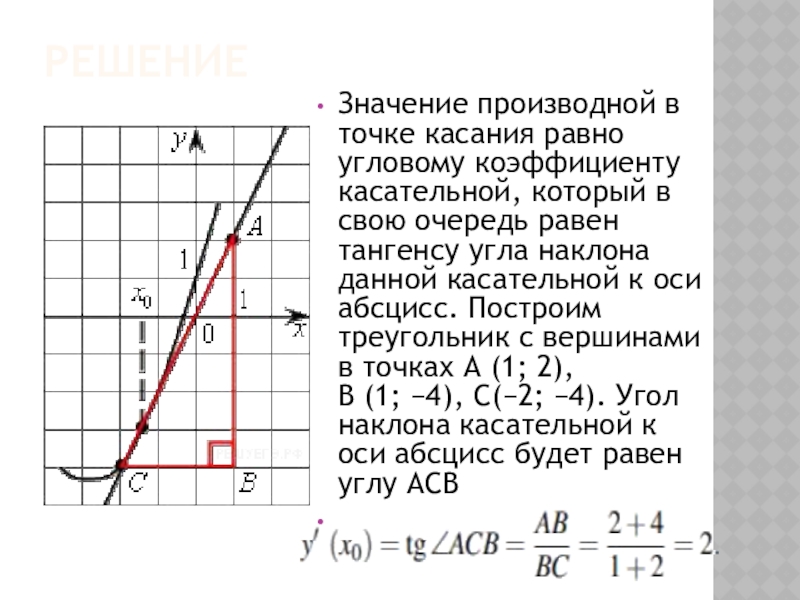 РЕШЕНИЕЗначение производной в точке касания равно угловому коэффициенту касательной, который в свою очередь равен тангенсу угла наклона