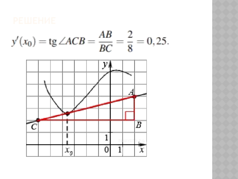 Слайд 9Значение производной в точке касания равно угловому коэффициенту касательной. Поскольку касательная
