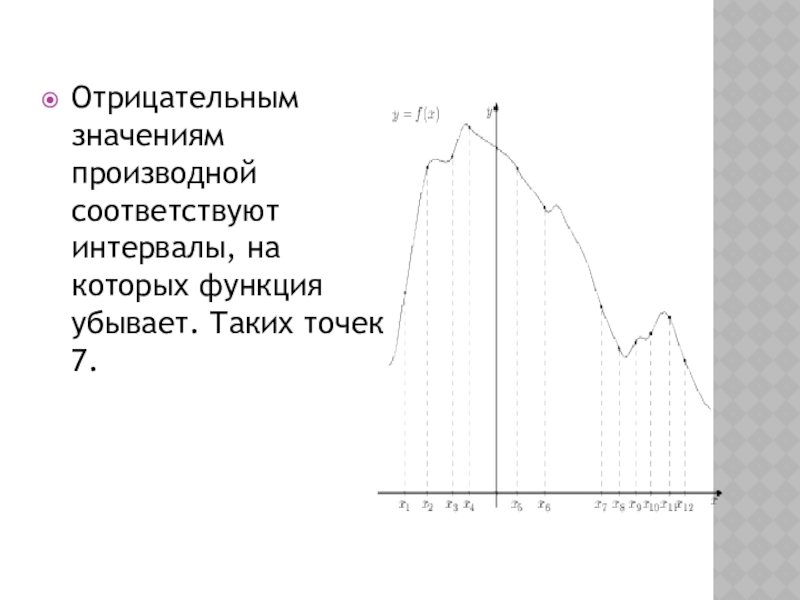 Слайд 13Отрицательным значениям производной соответствуют интервалы, на которых функция убывает. Таких точек