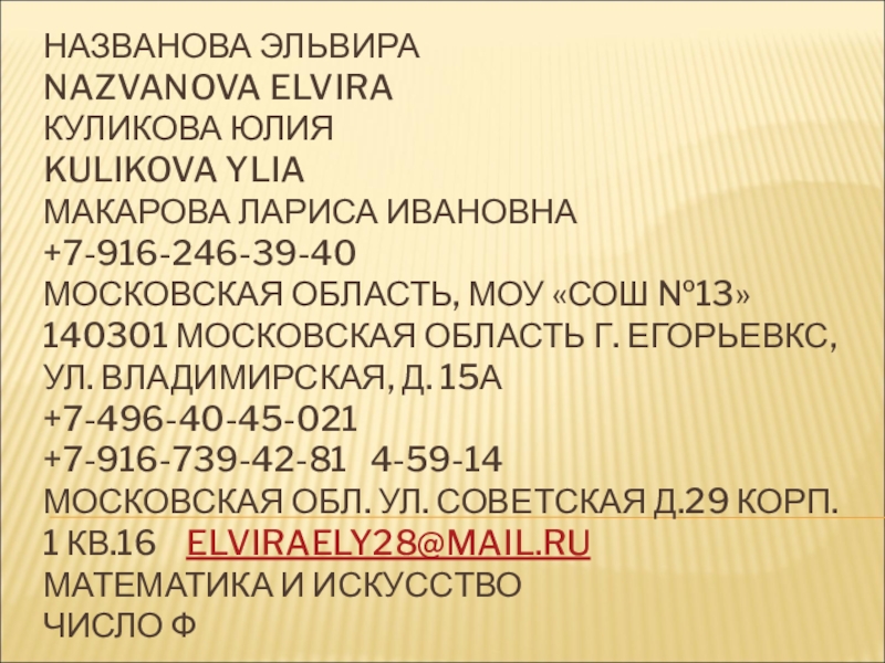 МОСКОВСКАЯ ОБЛ. УЛ. СОВЕТСКАЯ Д.29 КОРП. 1 КВ.16 ELVIRAELY28@MAIL.RU