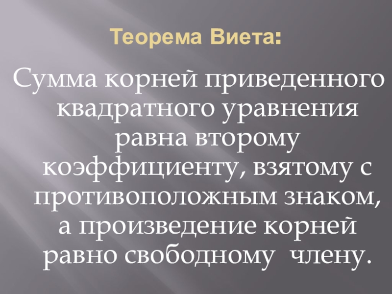 Теорема Виета:Сумма корней приведенного квадратного уравнения равна второму коэффициенту, взятому с противоположным знаком, а произведение корней равно
