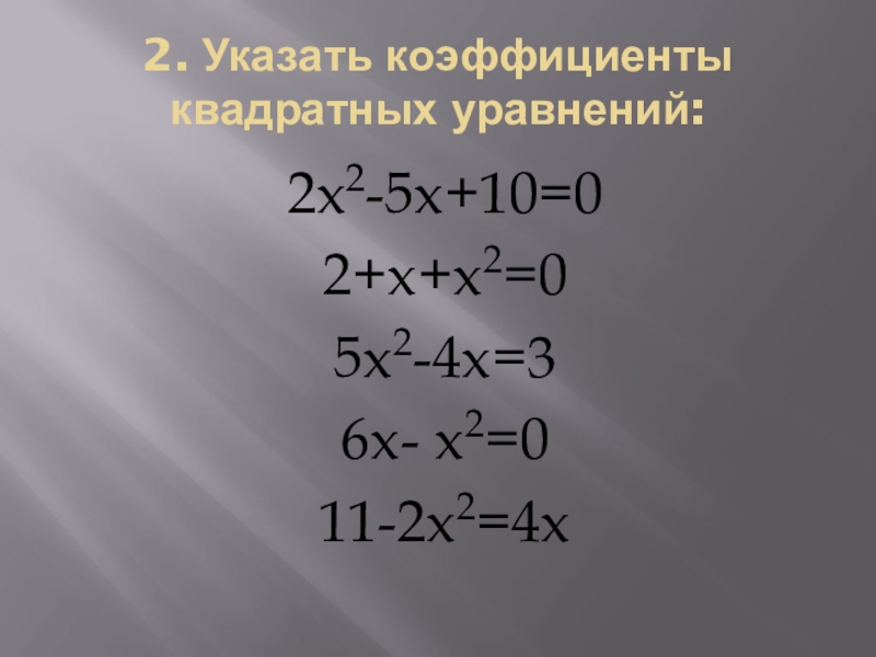 2. Указать коэффициенты квадратных уравнений:2x2-5x+10=02+x+x2=05x2-4x=36x- x2=011-2x2=4x