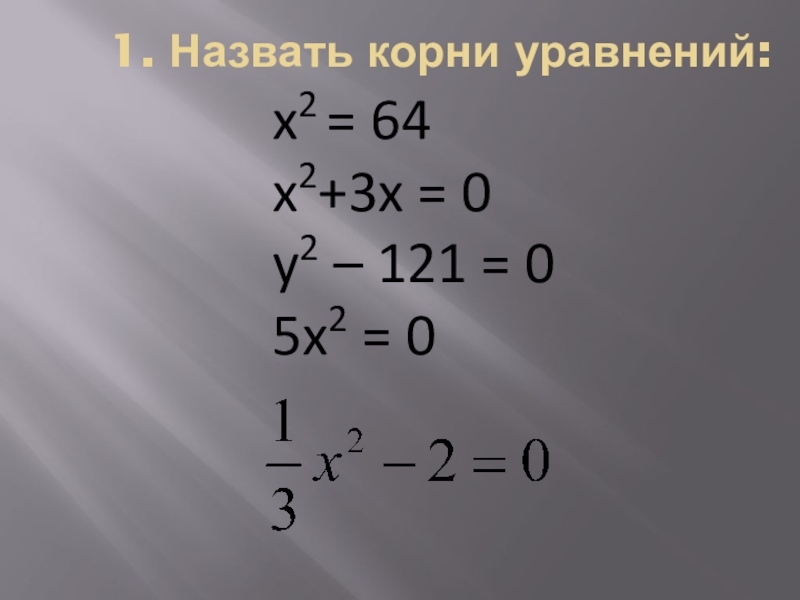 1. Назвать корни уравнений:x2 = 64x2+3x = 0	y2 – 121 = 05x2 = 0