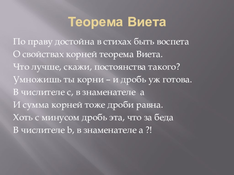 Теорема ВиетаПо праву достойна в стихах быть воспетаО свойствах корней теорема Виета.Что лучше, скажи, постоянства такого?Умножишь ты