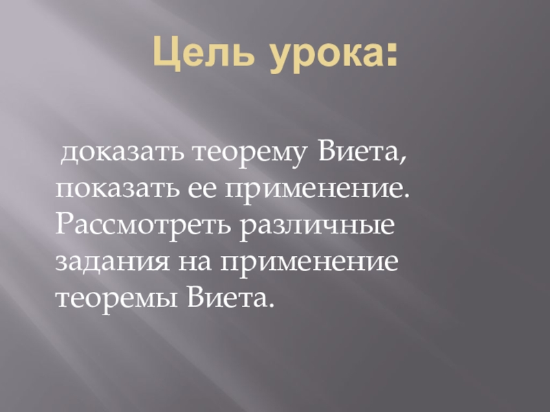 Цель урока:  доказать теорему Виета, показать ее применение. Рассмотреть различные задания на применение теоремы Виета.