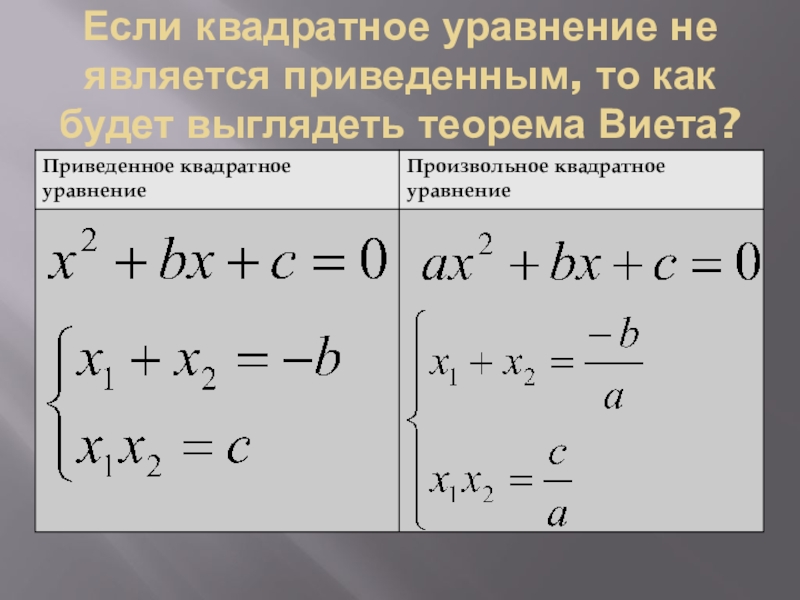 Слайд 11Если квадратное уравнение не является приведенным, то как будет выглядеть теорема