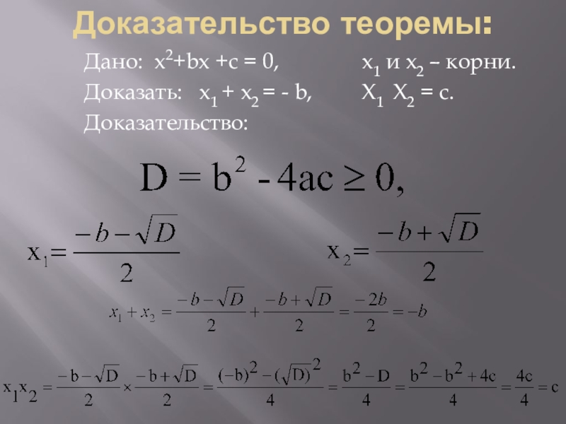 Доказательство теоремы:    Дано: x2+bx +c = 0,