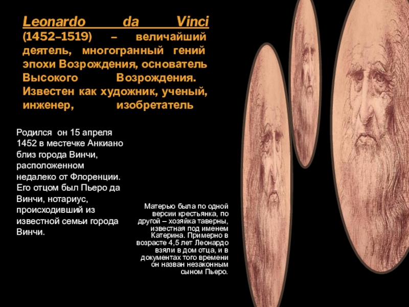 Родился он 15 апреля 1452 в местечке Анкиано близ города Винчи, расположенном недалеко от Флоренции. Его отцом был Пьеро да Винчи, нотариус, происходивший из известной семьи города Винчи.
