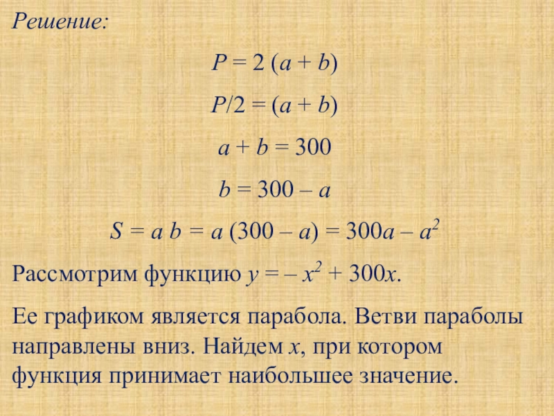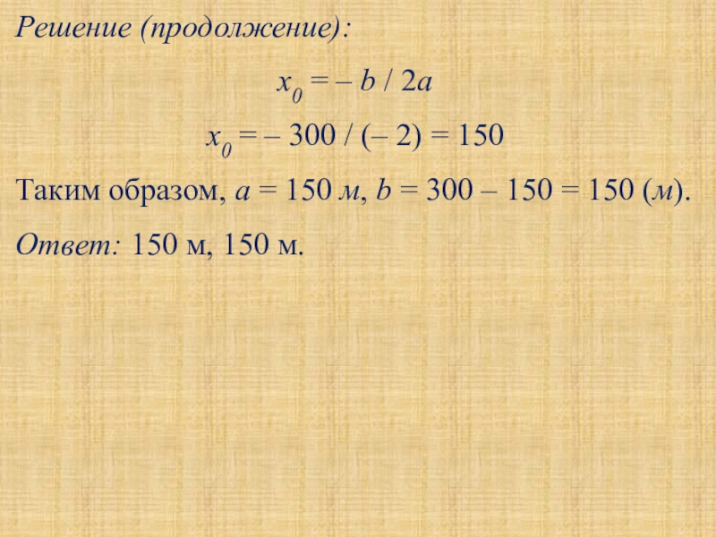 Решение (продолжение):x0 = – b / 2ax0 = – 300 / (– 2) = 150Таким образом, а