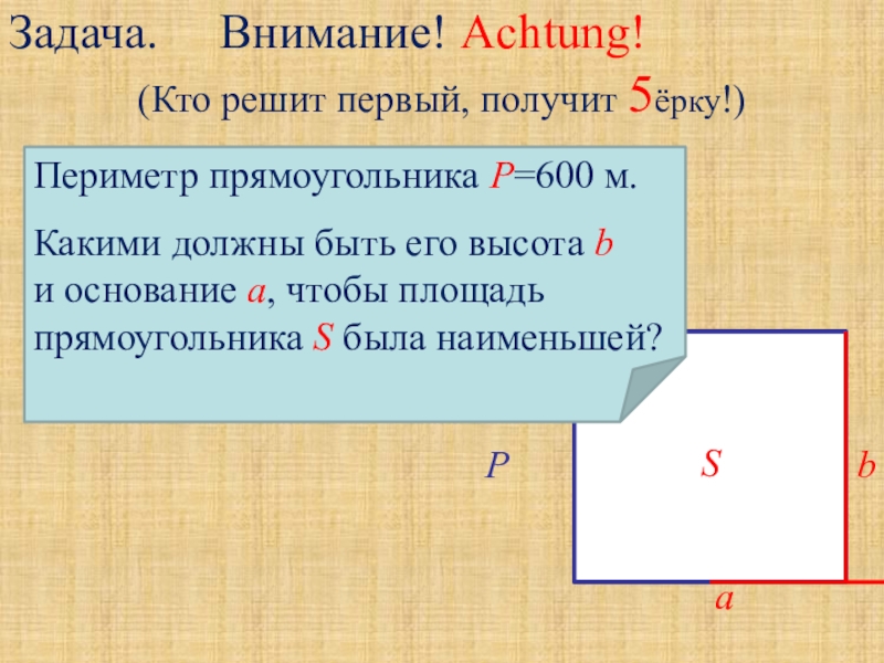Задача.   Внимание! Achtung!(Кто решит первый, получит 5ёрку!)Периметр прямоугольника P=600 м.Какими должны быть его высота b