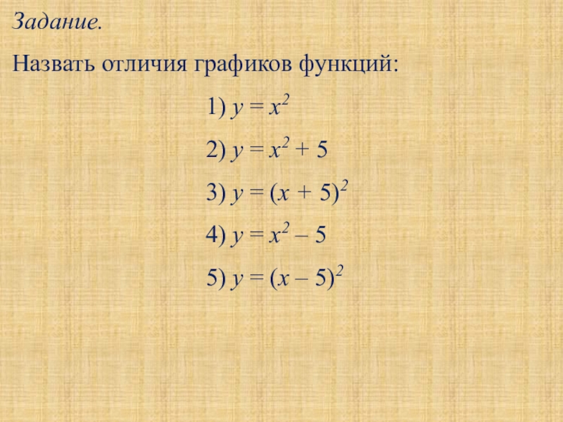 Задание.Назвать отличия графиков функций:1) y = x22) y = x2 + 53) y = (x + 5)2