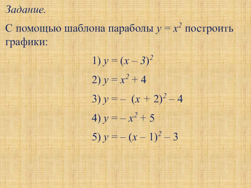 Задание.С помощью шаблона параболы y = x2 построить графики:1) y = (x – 3)22) y = x2