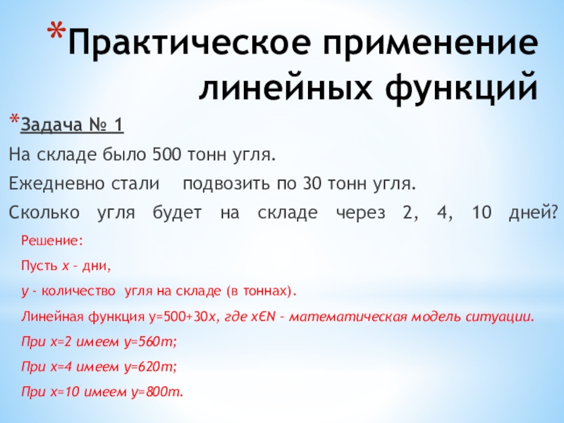 Линейная функция у=500+30х, где хЄN – математическая модель ситуации. При х=2 имеем у=560т;
