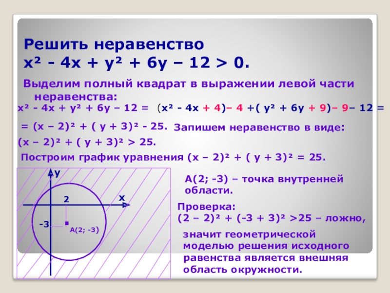 Проверка: (2 – 2)² + (-3 + 3)² >25 – ложно,