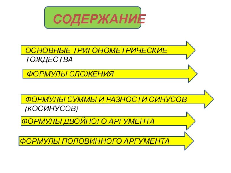 СОДЕРЖАНИЕОСНОВНЫЕ ТРИГОНОМЕТРИЧЕСКИЕ ТОЖДЕСТВАФОРМУЛЫ СЛОЖЕНИЯФОРМУЛЫ СУММЫ И РАЗНОСТИ СИНУСОВ (КОСИНУСОВ)ФОРМУЛЫ ДВОЙНОГО АРГУМЕНТАФОРМУЛЫ ПОЛОВИННОГО АРГУМЕНТА