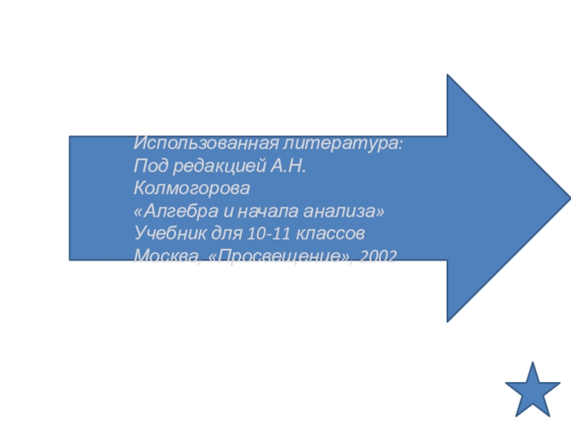 Использованная литература:Под редакцией А.Н. Колмогорова«Алгебра и начала анализа»Учебник для 10-11 классовМосква, «Просвещение», 2002