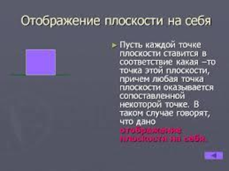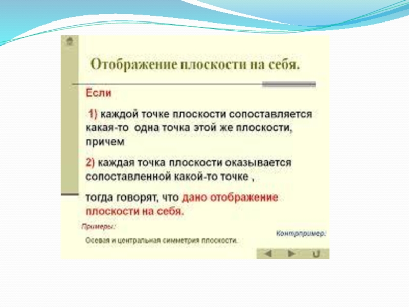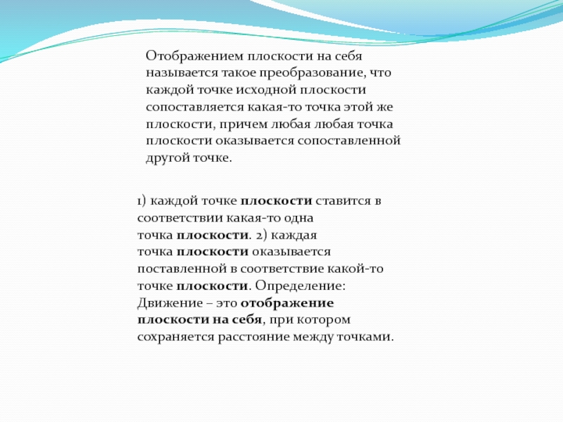 1) каждой точке плоскости ставится в соответствии какая-то одна точка плоскости. 2) каждая точка плоскости оказывается поставленной в соответствие какой-то точке плоскости. Определение: Движение – это отображение плоскости на себя, при котором сохраняется расстояние между точками.