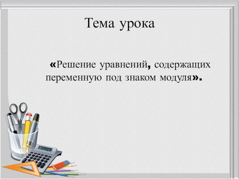 Тема урока   «Решение уравнений, содержащих переменную под знаком модуля».