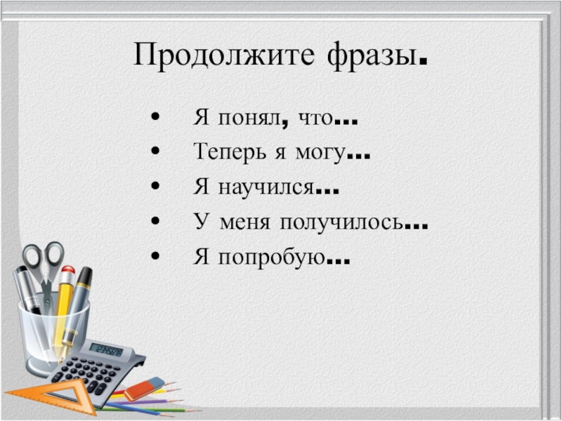 Продолжите фразы.Я понял, что…Теперь я могу…Я научился…У меня получилось…Я попробую…