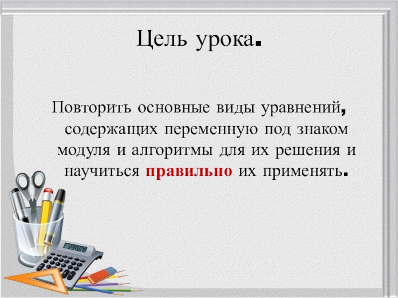 Цель урока.Повторить основные виды уравнений, содержащих переменную под знаком модуля и алгоритмы для их решения и научиться