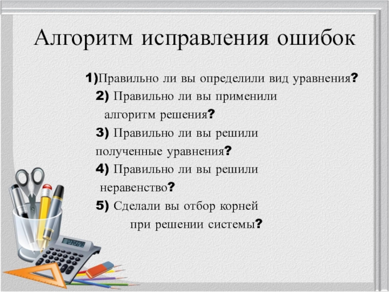 Алгоритм исправления ошибокПравильно ли вы определили вид уравнения?2) Правильно ли вы применили алгоритм решения?3) Правильно ли вы