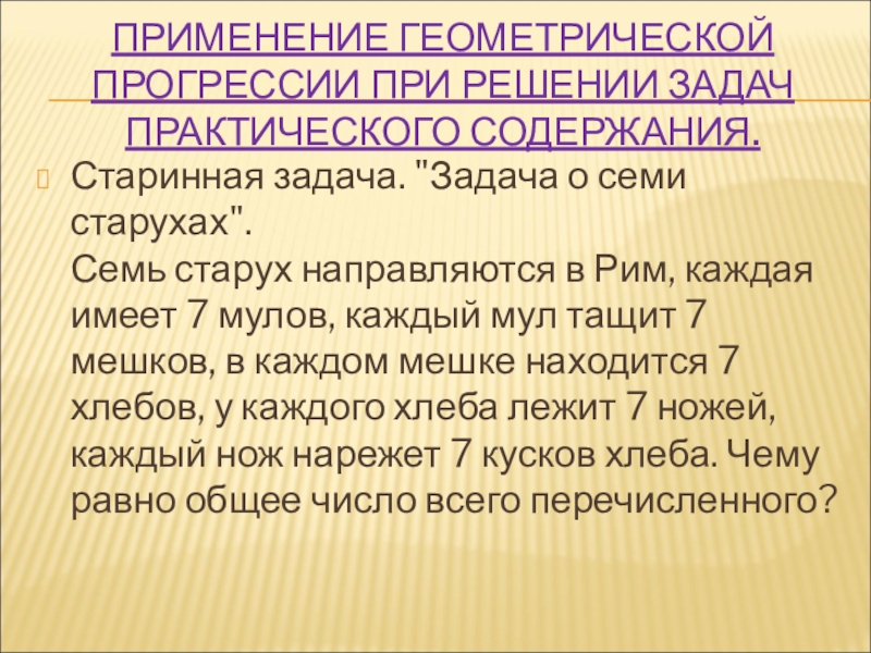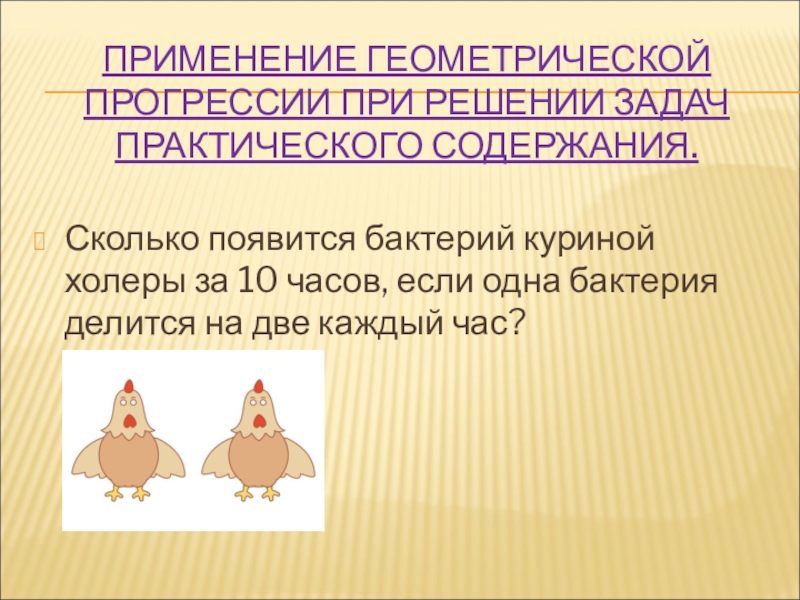 Слайд 12ПРИМЕНЕНИЕ ГЕОМЕТРИЧЕСКОЙ ПРОГРЕССИИ ПРИ РЕШЕНИИ ЗАДАЧ ПРАКТИЧЕСКОГО СОДЕРЖАНИЯ.