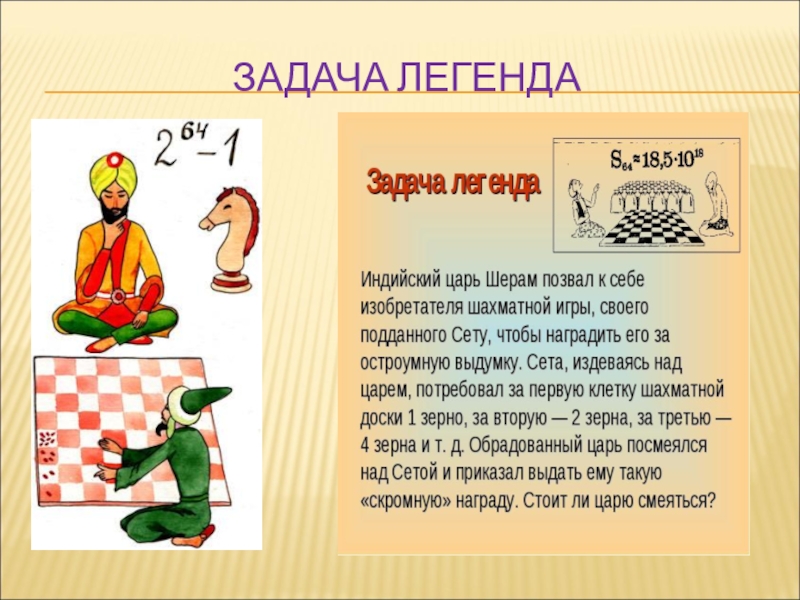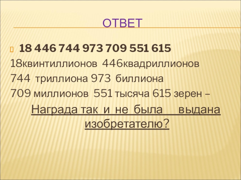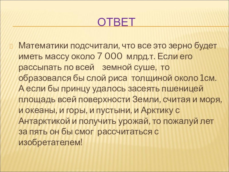 000 млрд.т. Если его рассыпать по всей земной суше, то образовался бы слой риса толщиной около 1см. А если бы принцу удалось засеять пшеницей площадь всей поверхности Земли, считая и моря, и океаны, и горы, и пустыни, и Арктику с Антарктикой и получить урожай, то пожалуй лет за пять он бы смог рассчитаться с изобретателем!