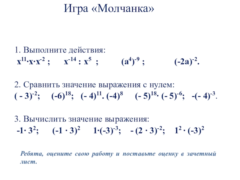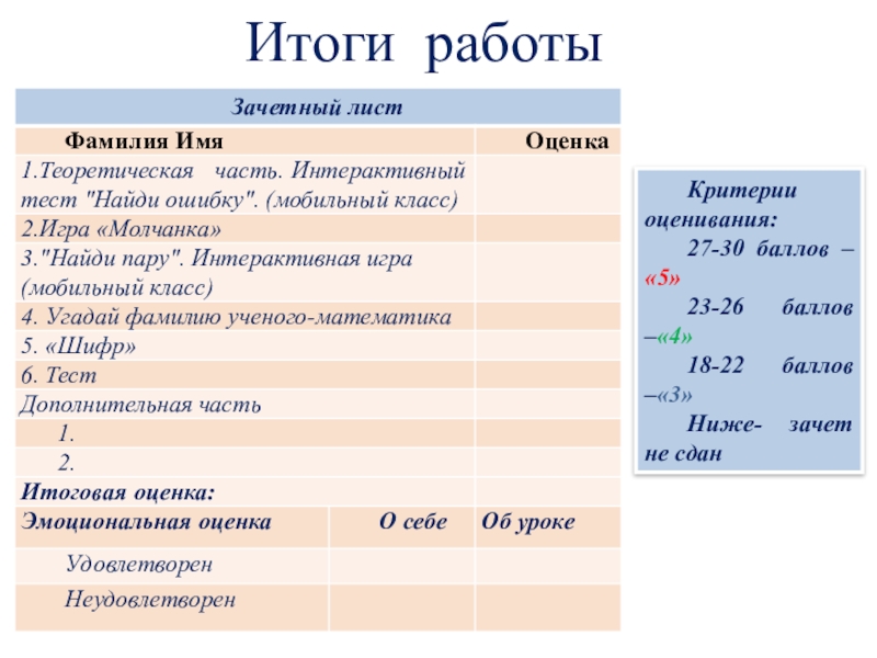 Ребята, оцените свою работу и поставьте оценку в зачетный лист.