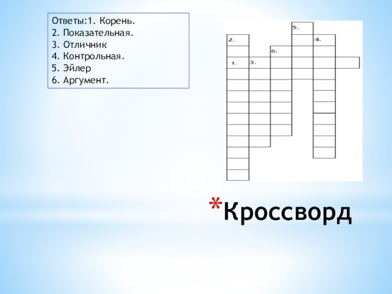 Кроссворд Ответы:1. Корень.2. Показательная. 3. Отличник4. Контрольная.5. Эйлер6. Аргумент.