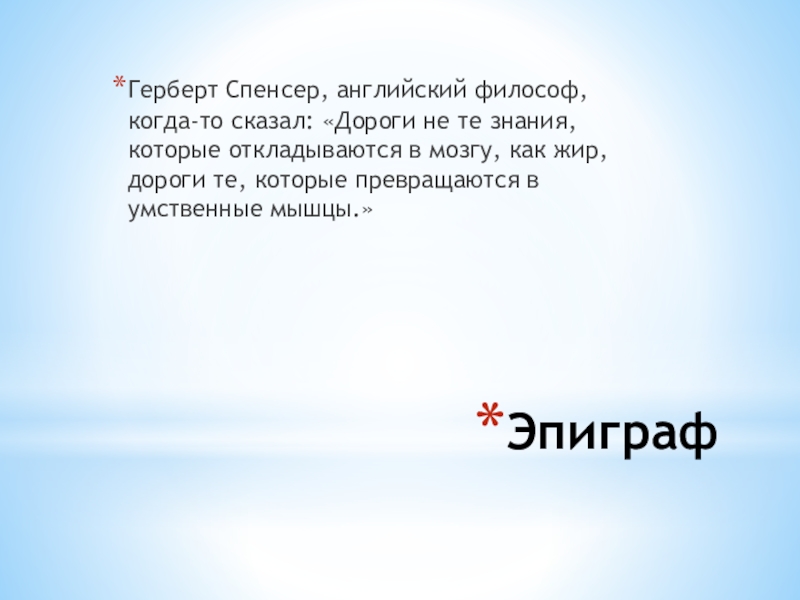 ЭпиграфГерберт Спенсер, английский философ, когда-то сказал: «Дороги не те знания, которые откладываются в мозгу, как жир, дороги