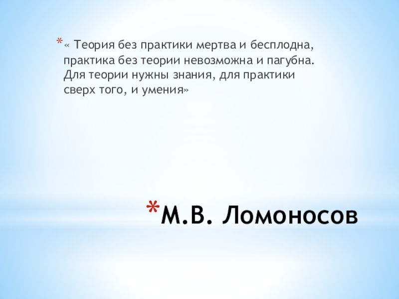 М.В. Ломоносов« Теория без практики мертва и бесплодна, практика без теории невозможна и пагубна. Для теории нужны