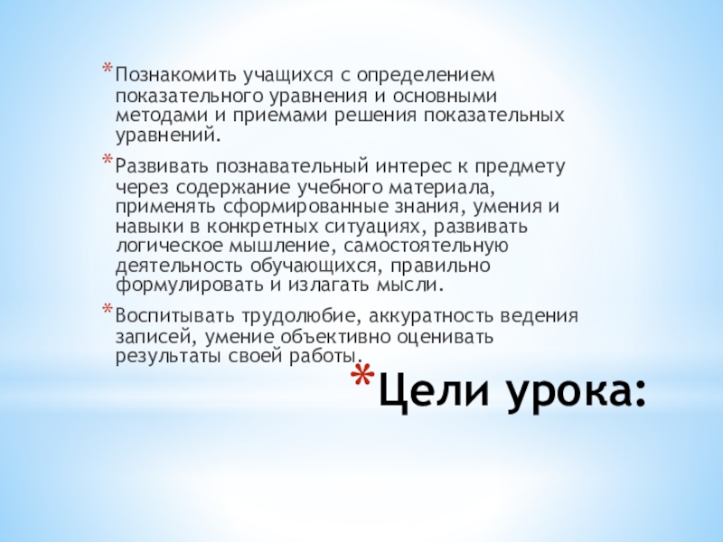 Цели урока:Познакомить учащихся с определением показательного уравнения и основными методами и приемами решения показательных уравнений.Развивать познавательный интерес к предмету через содержание учебного материала, применять сформированные знания, умения и навыки в конкретных ситуациях, развивать логическое мышление, самостоятельную