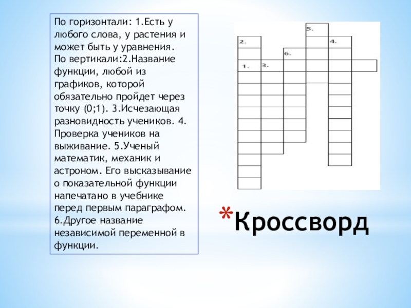 По вертикали:2.Название функции, любой из графиков, которой обязательно пройдет через точку (0;1). 3.Исчезающая разновидность учеников. 4.Проверка учеников на выживание. 5.Ученый математик, механик и астроном. Его высказывание о показательной функции напечатано в учебнике перед первым параграфом. 6.Другое название независимой переменной в функции.