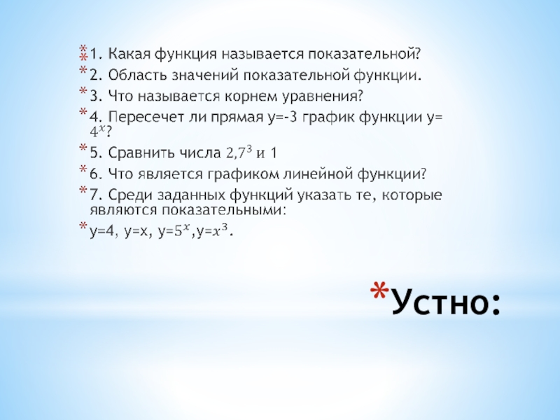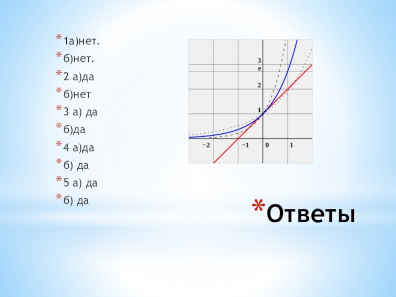 3. а) верно ли, что областью определения показательной функции является R? б) верно ли, что график показательной функции проходит через точку с координатой(0;1)?